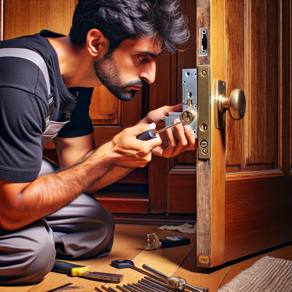 מנעולן מקצועי בפעולה, מתקין מנעול חדש על דלת לקוח.
